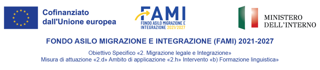 Il progetto viene realizzato e finanziato a valere dell’Obiettivo specifico 2: Migrazione legale e Integrazione – Misura di attuazione 2.d: Promuovere misure di integrazione per l’inclusione sociale ed economica dei cittadini di paesi terzi e misure di protezione delle persone vulnerabili nel contesto delle misure di integrazione, facilitare il ricongiungimento familiare e preparare la partecipazione attiva dei cittadini di paesi terzi alla società di accoglienza e la loro accettazione da parte della stessa, con il coinvolgimento di autorità nazionali e, in particolare, regionali o locali nonché organizzazioni della società civile, comprese le organizzazioni di rifugiati e quelle guidate da migranti, e le parti sociali – Ambito di applicazione 2.h: Misure di integrazione, quali un sostegno mirato in conformità delle esigenze dei cittadini di paesi terzi e programmi di integrazione incentrati sulla consulenza, sull’istruzione e sulla formazione linguistica e di altro tipo, per esempio corsi di educazione civica e orientamento professionale – Intervento b): Formazione linguistica, del Programma Nazionale FAMI.